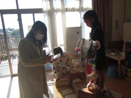 年長児が,友達と見事に『役割分担』をしてお店屋さんごっこをする姿・年中児が集中してダイナミックに絵をかく姿・そして年少児が,安定して友達や先生と一緒に『サンタさん』になって遊ぶ姿などを見ていただきました。