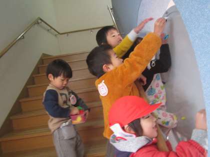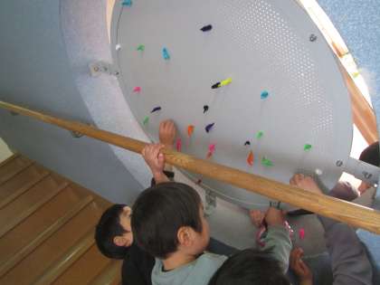 みつば幼稚園の階段のところには小さな穴がいっぱい空いている円形のボードがあります。