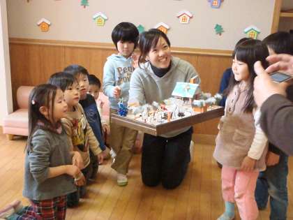 ホールに4,5歳児が集まりました。サンタさんになってミニチュアハウスをくださったので,子どもたちは大喜びです。とても素敵につくってあり,子どもたちは真剣に見入っていました。「これからも元気に遊んでくださいね」というメッセージもいただきました。とても嬉しい気持ちのプレゼントをいただきました。こんな風に子どもたちのことを見てくださっているんだなと思うとより,嬉しい気持ちでいっぱいになりました。子どもたちにもきっと伝わってくれると思います。有難うございました。