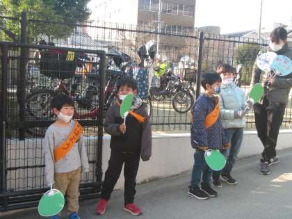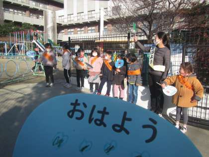 みつば幼稚園でも,教職員だけでなく,年長組の子どもたちが,グループごとに順番に門に立ち,『あいさつ押し』グッズのうちわやタスキを身につけて,元気に「おはようございます!」と声をかけてくれました。
