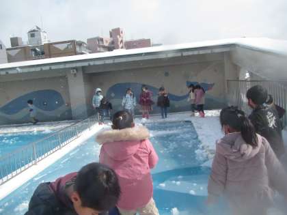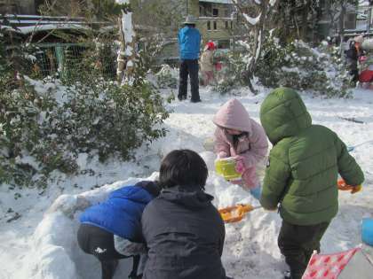 園庭中を埋め尽くす『白』の世界や『キラキラ』かがやく『光』の世界に心を動かされていました。もちろん雪合戦や雪だるまつくりも楽しみましたし・・・かまくらつくり・雪うさぎつくり…雪かきごっこ・つらら探しにつらら落とし・雪の上でダイビング!,そして屋上のプールの氷探しなど,本当に様々な楽しい遊びを見つけ出していました。雪・・・だけで,こんなに楽しい様々な遊びを見つけられる子どもたちの力ってすごいですね!