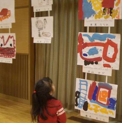 朝から子どもたちもクラスごとに遊戯室へ園内展を見にやってました。