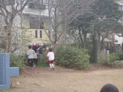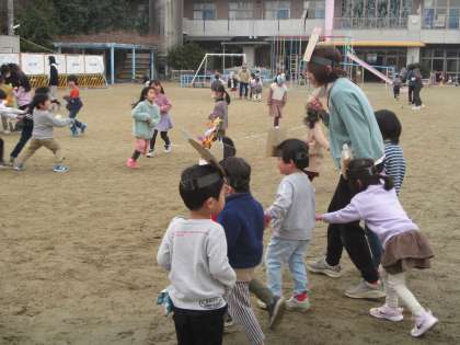 豆まき当日は・・・クラスごとに『オニ役』と『豆まき役』に分かれて,広い園庭を走り回っていました。一生懸命追いかけたり…茂みに隠れたり・・・ワクワクドキドキを楽しんでしました。