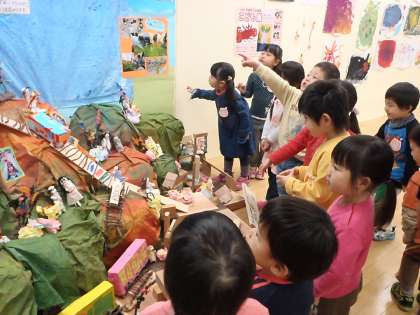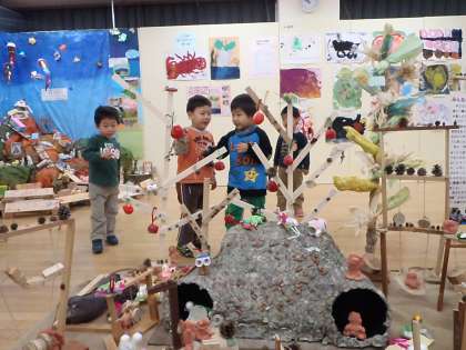 3歳児の子どもたちも展示場所に入るなり,目をキラキラさせていろいろな幼稚園の作品を見ていました。