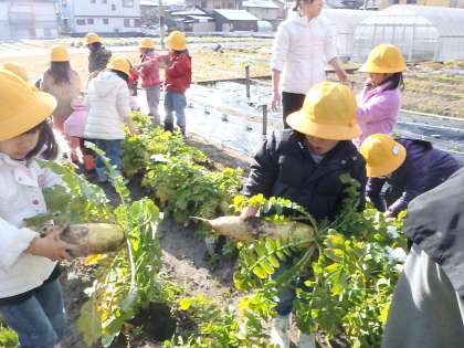 昨日のこども展の見学に続き,ゆり組さんは西賀茂農園に大根の収穫に出かけました。