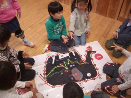 「サイコロが欲しい」「サイコロをつくりたい」と言うかなと思って待っていたら,じゃんけんのルールを子どもたちが考え出したのだそうです。