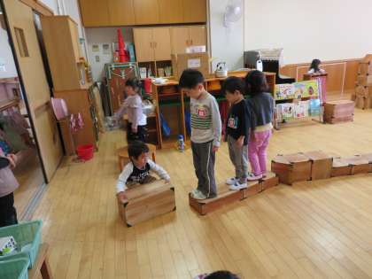 この日は『木』の中積木で遊びことが大好きです!長〜くつないで,友達がどんどん乗ってきてくれました。少し重たい積み木を自由につなげることや,友達と一緒に乗ってみること,いろんな高さがあることなどがとても楽しそうでした。