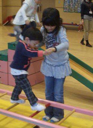 はしごを渡るときには危なくないか側につき,怖がる子どもがいたら優しく手を差し伸べます。