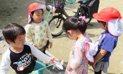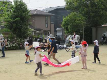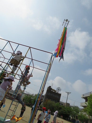 いよいよ5月!子どもたちは自分の『かざぐるま』や『こいのぼり』を作ったり,大きな『こいのぼり』と一緒に遊んだりしています。