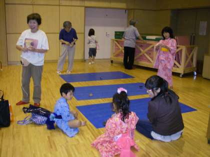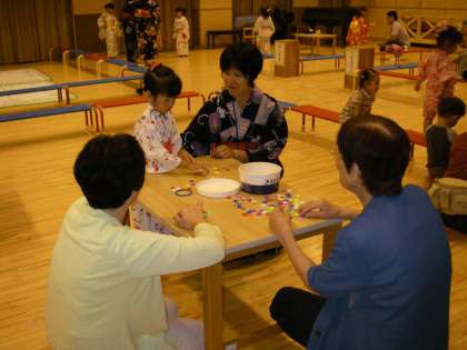 遊戯室やせせらぎホールでは,お手玉・おはじき,こままわし,あやとり,けん玉,めんこなどの子どもたちにとってはちょっと珍しい昔の遊びを用意してくださいました。