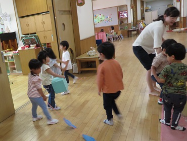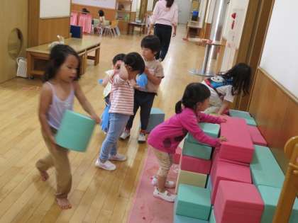 3歳児たちも連休を終え,園生活の流れがわかり,先生たちや友達と一緒にいることに安心感をもって遊んでいます。子どもたちにとって,いろいろなことが『あそび』です。この日もみんなが積み木を片付ける場所に『いそいそ』と運んでいます。そして受取の場所では,先生が『ハンコです!』と子ども手のひらに,先生の『グーハンコ』を『ポン!』と押してくれます。積み木のお片付けも楽しい『あそび』になるんですね!