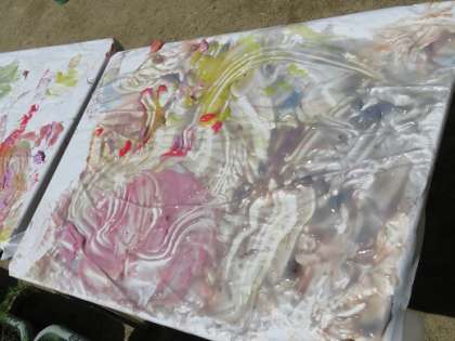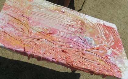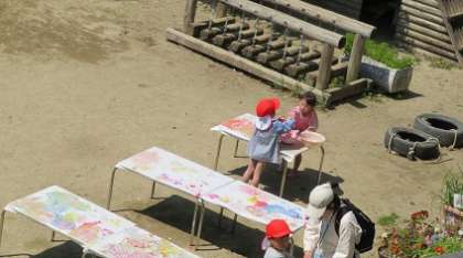 4歳児は今日は,お日様の光を浴びて,『のり絵の具』の感触を楽しみました。色とりどりの絵の具の『色の美しさ』や『変化』を感じたり,『ぬりぬり』『べたべた〜』の感触を思い思いに楽しんだりしていました。