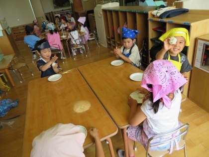 幼稚園のお庭で育てた『お豆』や『人参』を使って『みつばランチの日』でした。種から育てた野菜たちはとってもおいしく,お家では『苦手…』と思っていたお野菜も『パクパク』食べる姿も見られました。