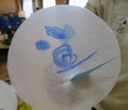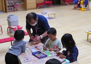 今日は,元みつば幼稚園の教頭で今みらい館におられる「芝井先生」をお招きして,預かり保育で『作って遊ぼう!』を行いました。洗濯ばさみなどを使って『お口が動くおもちゃ』を作りました。一人一人『自分の作りたいお顔』を工夫していました。また完成した後は,友達と『おはなし』をしたり,紙で作ったごちそうを食べさせてあげたり・・・いろいろな遊びに発展していきました。