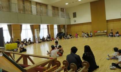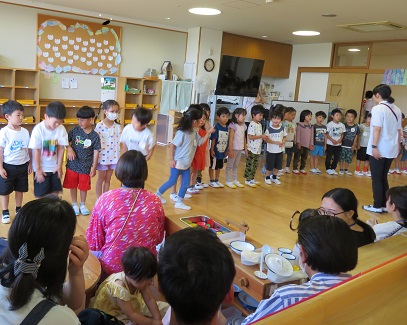 6月4日 4年ぶりに全園児が集い『日曜参観』を行いました。保護者の方と一緒に『ふれあい遊び』をしたり,『製作』をしたり,歌を聞いていただいたりしました。