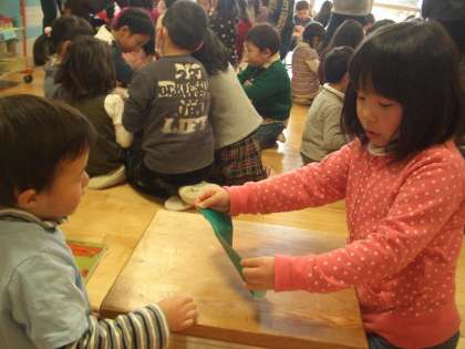 5歳児のゆり組が作り方を覚え,3歳児のたんぽぽ組ともも組,4歳児のばら組に教えにいってくれました。