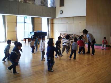 音楽に合わせて踊ったり,先生の弾くピアノの音に合わせて動いたり,とっても楽しそう。