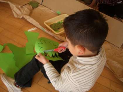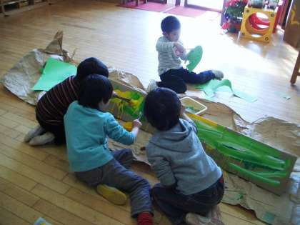 4歳児のばら組の保育室では,段ポールにぺたぺたと絵の具を塗っている子どもがいました。