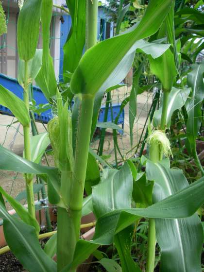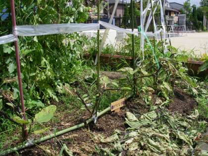 雨が続き,園庭の野菜や草花は水をたっぷり吸って大きくなっています。トウモロコシも実をつけてきています。でもナスなどは,雨でちょっと傷んでしまっていたりしています。秋にまた美味しいナスができてほしいので,今日ナスの剪定をしました。肥料も入れて,少しナスの木を休ませておきたいと思います。