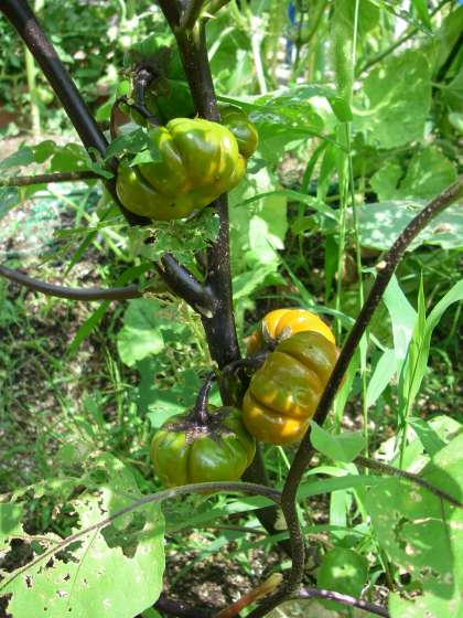 ナスは接木されていてその台木から実がなっているのです。カボチャのような実ですね。これは「赤ナス」というそうで,観賞用のナスです。天神さんのお祭り「ずいき祭り」のずいきみこしにはふんだんに使われているもです。また幼稚園にこられたらご覧くださいね。