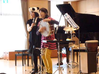 10時に音楽会が始まりました。ハッピーバースディ・バンドのメンバーはネコさん(ピアノ)とキリンさん(打楽器全般)とゾウさん(トロンボーン)とパンダさん(歌と司会・ピアノ)の4人の方です。始めは,「アイ・ガット・リズム」という曲でスタートしました。迫力のある歌声で子どもたちは聴き入っていました。