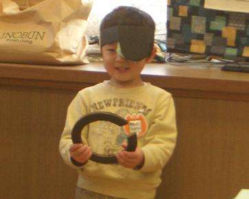 フック船長のようにアイパッチをして,穴が一部あいた円をもち,航海に出発します。