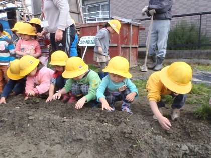 一人2回ずつ種芋を植えました。そしてジョウロで水遣りをして今日の活動はおしまい!4,5歳児なら畑の探検をしたりして楽しむのですが,3歳児は興味も持続時間もまだまだ短いので,今日はイモを植えることのみを楽しみました。