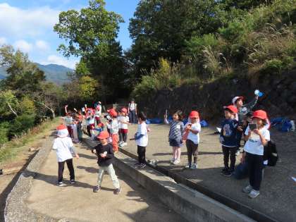 秋の自然を身体全体で感じたり,船岡山に上っている幼稚園『弟妹たち(年中・少児)』お家の方たちと「光の交信」(鏡に太陽光を反射させました)も楽しみました。