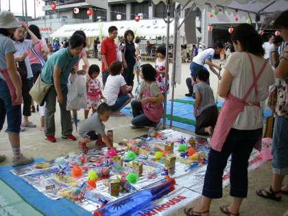 8月2日日曜日,新町小学校で「中立ふれあい広場」がありました。午後からの準備の時には,いい天気だったのにふれあい広場が始まる4時前頃から,だんだん雲行きが怪しくなってきました。「少し早めに始めましょう」という挨拶があり,いろいろな遊びのコーナーが始まりました。