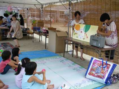 幼稚園の先生たちは大型絵本を3冊用意して,子どもたちが集まるのを待っていました。いろいろな遊びを終えた子どもたちが少し増えてきたので,5時過ぎにまず1冊目の絵本を読みました。お客様の子どもたちは一生懸命聞いてくれていました。
