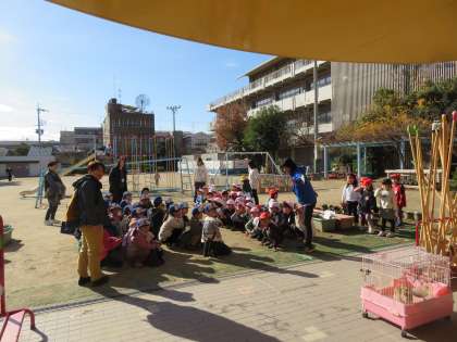 西陣中央小学校の1年生が生活科の授業『小動物と触れ合おう』の単元で,幼稚園に来てくれました。幼稚園のうさぎたちと触れ合うこと,そして幼稚園の子どもたちと一緒に遊ぶことを楽しんでくれました。