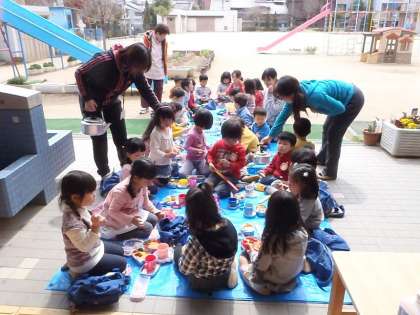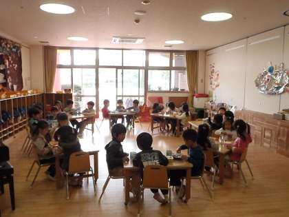 3歳児のたんぽぽ組ともも組,4歳児のばら組にとっては,今日が3歳児としての,4歳児としてのお弁当,最終日です。