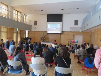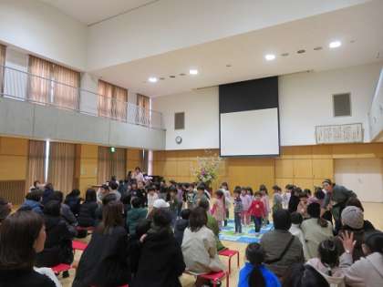 3月22日 年中児と年少児そして預かり保育利用の年長児も参加して,3学期の終業式を行いました。パワーポイントで,楽しかった・・・がんばった・・3学期の遊びを振り返ったり,春休みにしたいな!ということを話したりしました。そしてその後は進級のプレゼントをもらいました。年中児は先日の卒園式の年長児の姿をみていたのでしょう!とても自信をもって一人ずつプレゼントを受け取っていました。