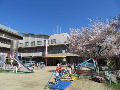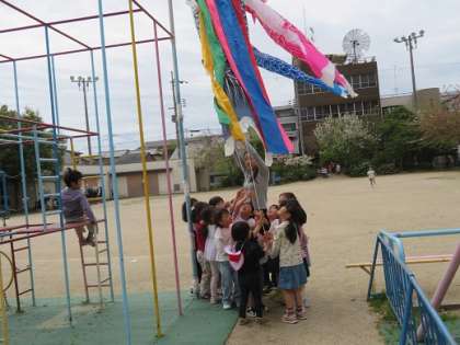 新入・進級した子どもたちは広い園庭で,のびのびと体を十分に動かし,様々な遊びに夢中になっています。思いきりどろんこを遊びをしたり・・・桜の桃色の花びらを見つめたり・・・大きなこいのぼりを空高く上げたり‥‥する中で,『春』の心地よさや楽しさを感じているようです。