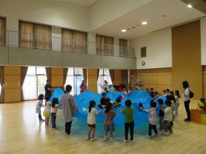大きなパラバルーン+風船で,体をいっぱい動かしたり,大きな布や風船の動き,そしてお友達がいいっぱい!という楽しさを味わいました。