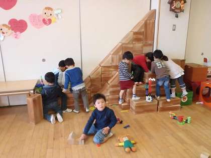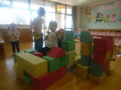 とくに中積木や遊戯室にある大積木は,自分よりも大きなものをつくることもできます。