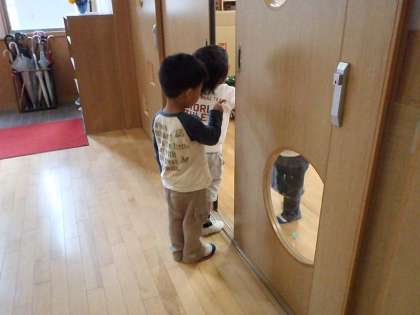 降園準備ができているのに,またまた保育室を飛び出して他の保育室へ遊びにいってしまいます。