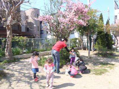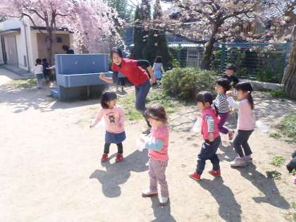 桜の木の側にいくと,3歳児のたんぽぽ組の先生と子どもたちが花びらを集めて遊んでいました。