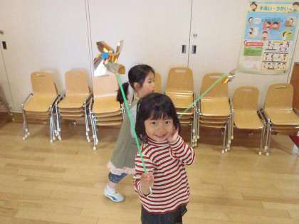 4歳児のばら組は,先生と一緒に自分で風車をつくりました。