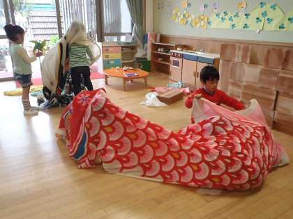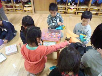 5歳児のゆり組の風車は,大きな紙から自分で切ったり針金を通したりしてつくります。