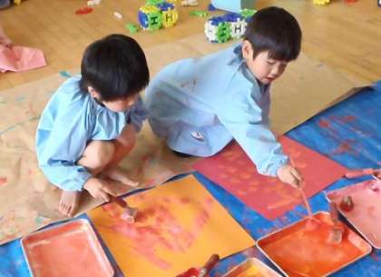 4歳児のばら組は,先週に引き続き,絵の具遊びで鯉のぼりをつくっています。