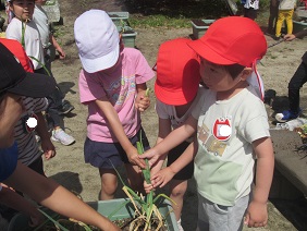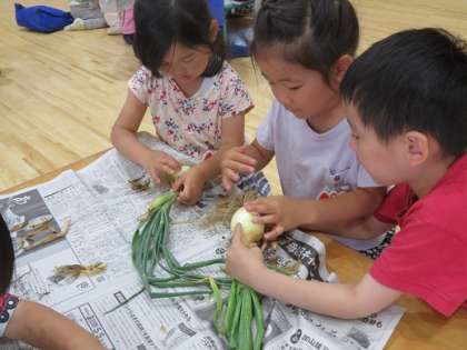 年中組が昨年度から育てている『玉ねぎ』年長児と年中児が力を合わせて,収穫したり,皮をむいたりして,楽しみました。そして…ホットプレートで素焼き!お塩をかけただけなのに・・・とってもおいしかったね!(玉ねぎが苦手だった子どもたちも,今日はおいしくいただいたようです!・・・玉ねぎ好きになったらいいね)