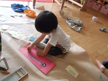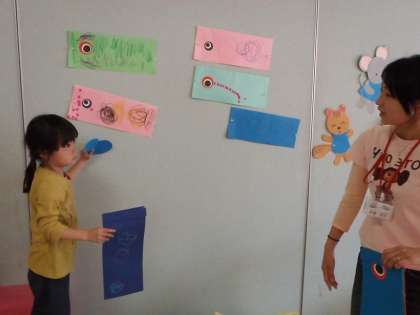 風車でいっぱい遊んだ3歳児のもも組とたんぽぽ組は,自分の鯉のぼりをつくりたくなりました。