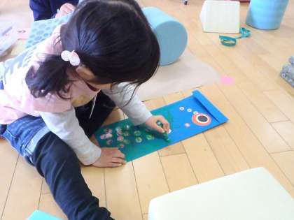 いろいろな色の画用紙にぺったんぺったんシールを貼ったり,パスで好きな色を塗ったりぐりぐりかきをしたりしました。
