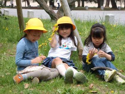 思い思いにたんぽぽをつんで首飾りにしたり,きれいな草花で遊んでいました。
