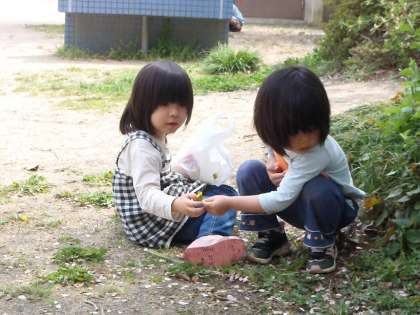 一人の子どもが草をひいて「大きな大根」とみたてて遊んでいるのを先生が楽しそうに認めているのを見て,「おもしろそうなことやってるな」「自分も同じように先生に認めて欲しいな」などの思いから同じように草をひきだしました。