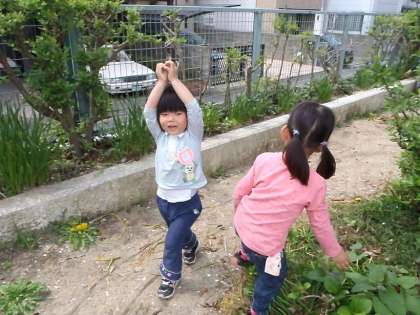 4歳児のばら組の子どもに誘われてたんぽぽ探しに出かけました。