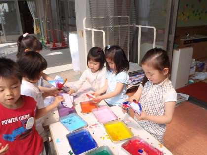 机の上には,きれいな色水が置かれていて,そこに折りたたんで和紙を少しずつひたしています。