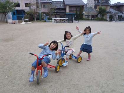 お弁当が終わって,ほっこりと園庭や広場に出て遊び始めた4歳児のばら組と5歳児のゆり組は,三輪車へ直行です。
