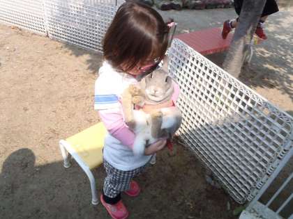 「お腹だけぎゅーっと抱くと,うさぎさん,しんどいよぉって思うから,椅子に座って抱っこしてあげようか」